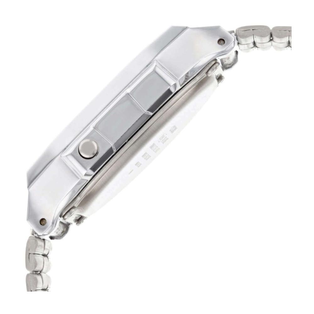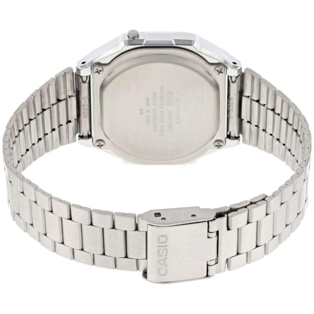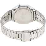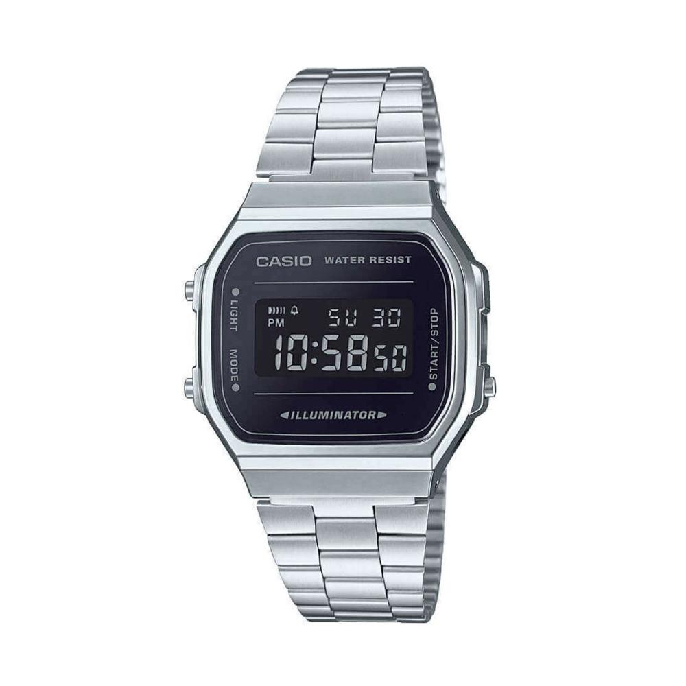 A classic CASIO design, part of the Vintage Retro Collection. This timepiece features a digital display, an Illuminator, daily alarm, and stopwatch. Resistant to minor splashing and has a black mirror face and shiny silver coloured bracelet.