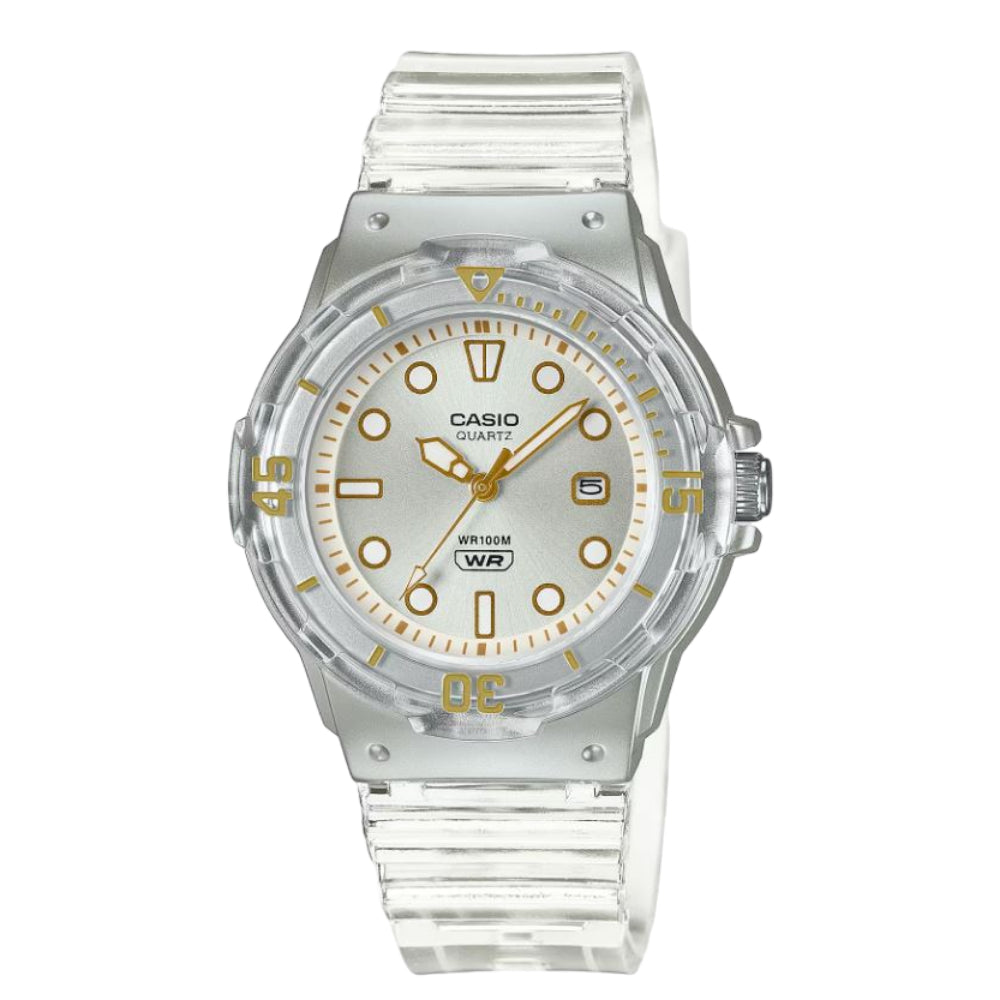 Soak in the shimmer and shine of a compact analog watch with translucent bezel and band.