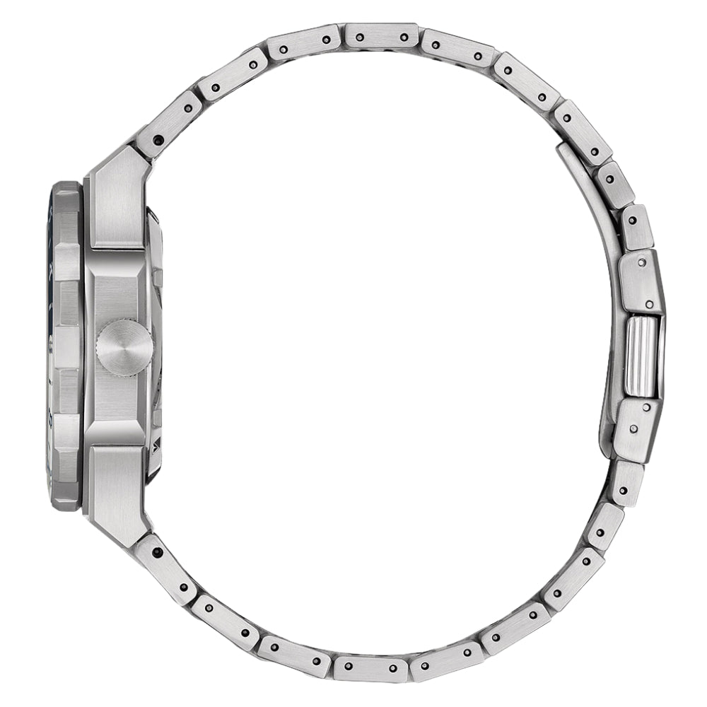 Functional and practical, modern and sporty–the Series8 880 GMT is the perfect companion for daily wear to spirited travel, and everything in between. Featuring a silver-tone stainless steel 41mm case with a blue- and white-tone bi-directional bezel, the model highlights the best of our brushed and polished finishing techniques. Water resistant to 100m and able to withstand magnetic fields up to 16,000 A/m, the watch is powered by the high-performance Caliber 9054, with the mechanism allowing for local and travel time displays alongside an independently set hour hand. The automatic GMT movement is visible through a sapphire exhibition case back and is capable of maintaining an accuracy of +20 / -10 seconds per day with a frequency of 28,800 v/h and a power reserve of 50 hours' tapered, integrated silver-tone stainless steel H-link bracelet secures the watch to the wrist, with its design following the aesthetic of the case via the use of polished and brushed facets. Beneath a sapphire crystal, the watch’s textured blue dial features applied indices and lume-filled hands, each working together to offer incredible legibility alongside a utility-driven 3 o'clock date window; an orange-tipped hand assists in keeping track of multiple time zones.