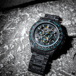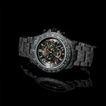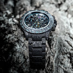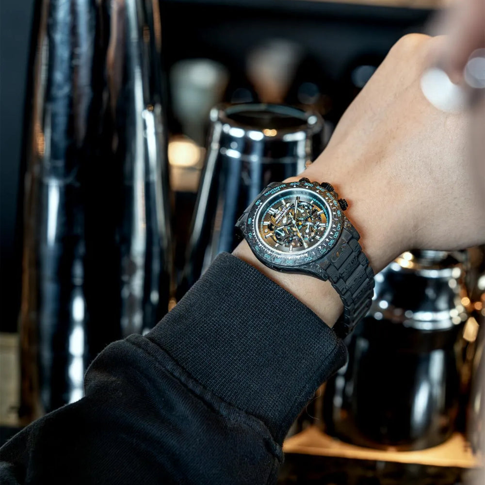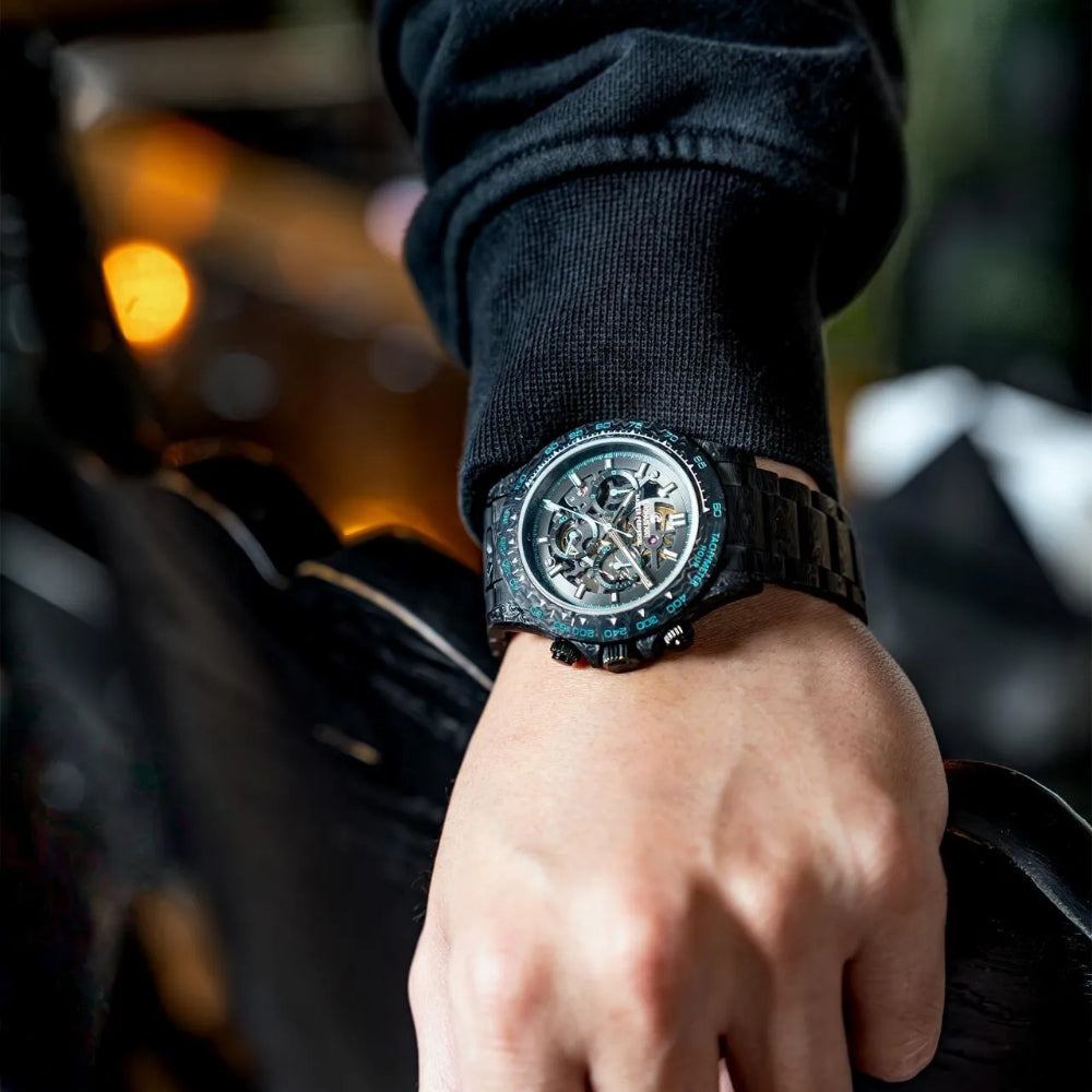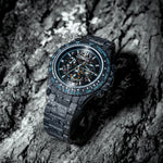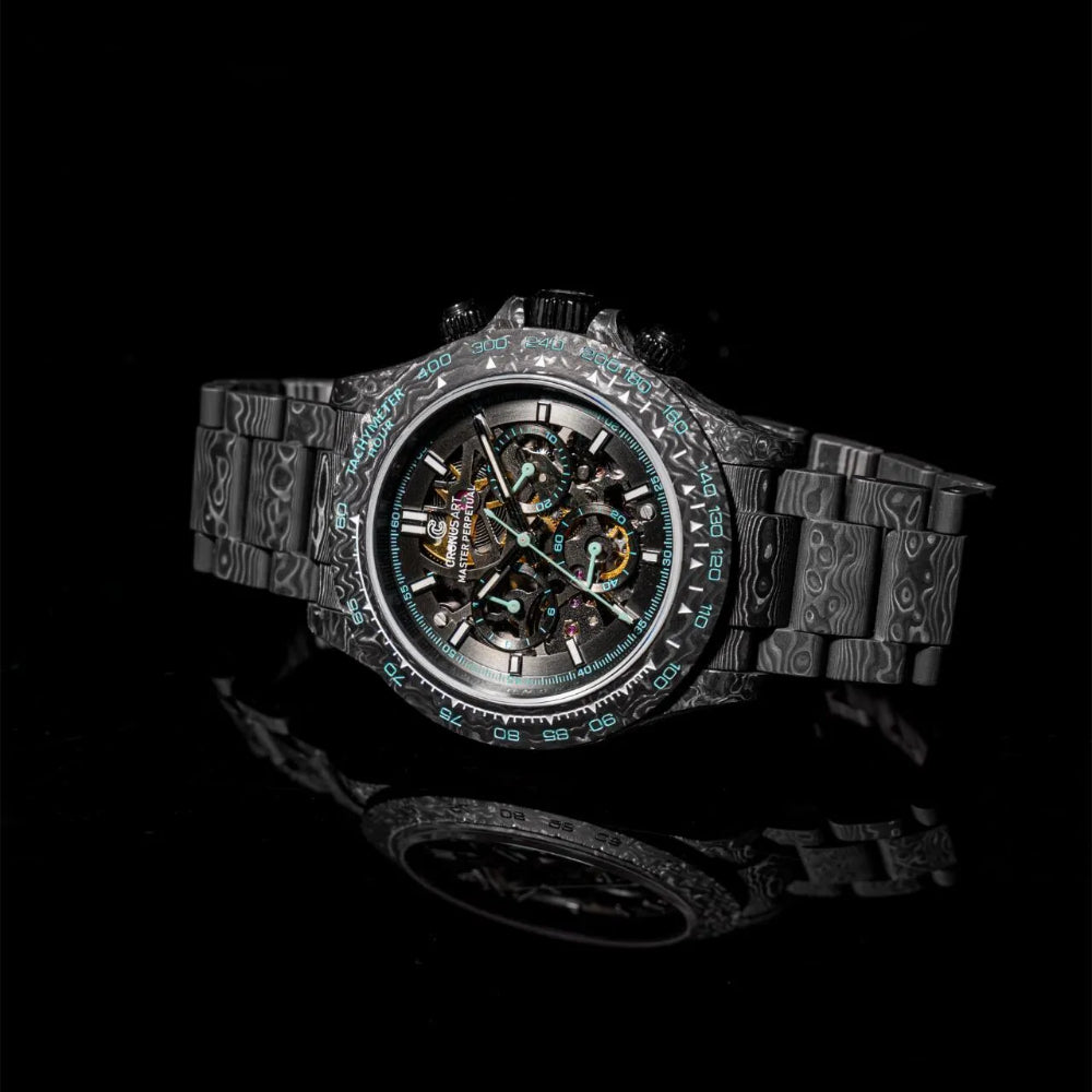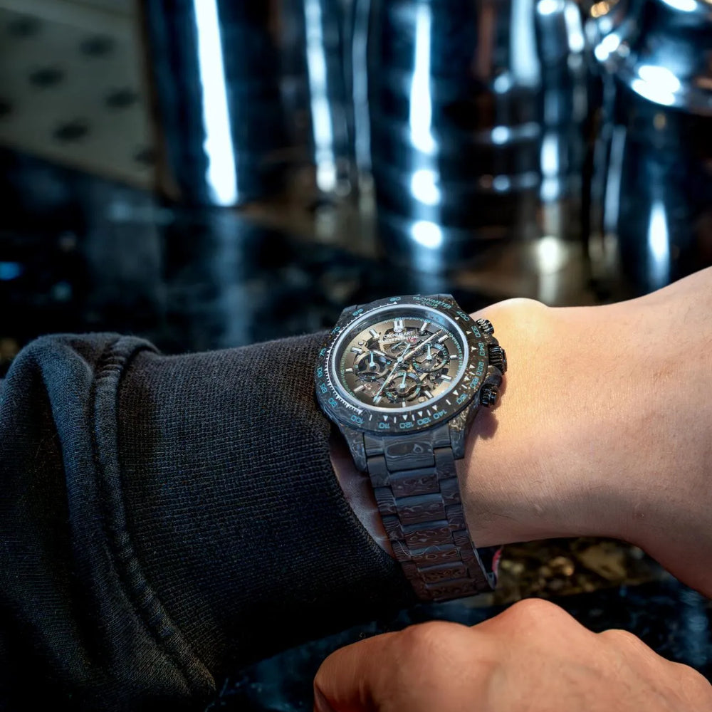 The Cosmic Daytona Series is a specially designed style combining together with the prototype of Rolex Daytona and with many different world ideas. It is an odometer version ideal for calculating up to 400 speed units per hour. The concept is designed to be stylish and combining of all the finishing on the design of a high-grade Carbon Fiber frame that is lightweight, comfortable, and extremely durable. Smooth texture with premium leather-trimmed canvas watch band at the clasp. All of which not only make it more comfortable to wear, but also enhance the shape with perfect function. Cronus Art has added free style, vitality and changed the Daytona feel to a brand new world on your wrist.