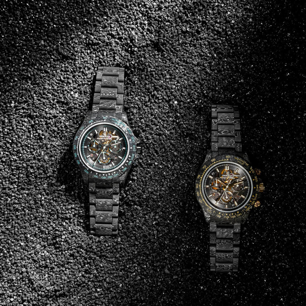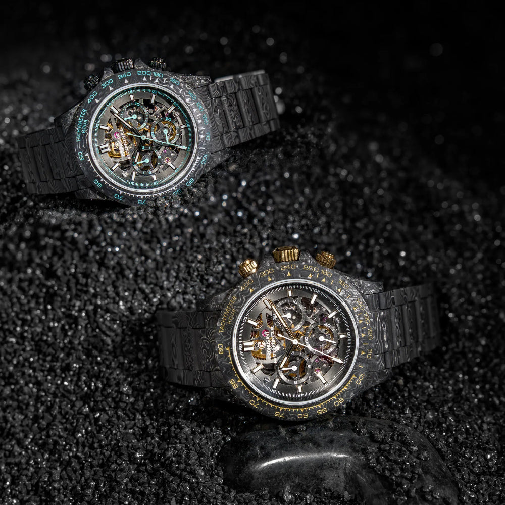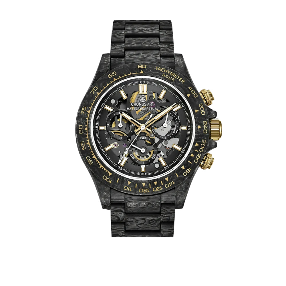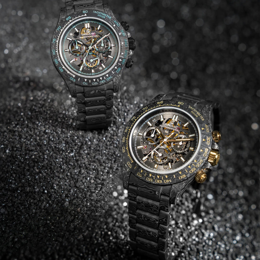 The Cosmic Daytona Series is a specially designed style combining together with the prototype of Rolex Daytona and with many different world ideas. It is an odometer version ideal for calculating up to 400 speed units per hour. The concept is designed to be stylish and combining of all the finishing on the design of a high-grade Carbon Fiber frame that is lightweight, comfortable, and extremely durable. Smooth texture with premium leather-trimmed canvas watch band at the clasp. All of which not only make it more comfortable to wear, but also enhance the shape with perfect function. Cronus Art has added free style, vitality and changed the Daytona feel to a brand new world on your wrist.