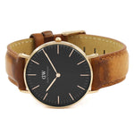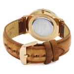 Rose gold-tone stainless steel case with a brown leather strap. Fixed bezel. Black dial with rose gold-tone hands and index hour markers. Minute markers around the outer rim.