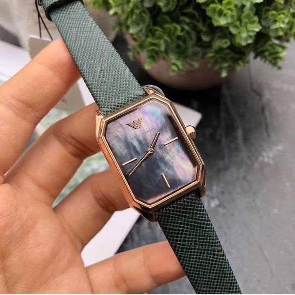 This 24mm watch features a glossy black mother-of-pearl dial with rose gold-tone stick indexes, two-hand movement and green leather strap. At Brandfield you buy the best Emporio Armani watches, like this Emporio Armani Gioia Watch AR11149. This watch has a quartz timepiece. The clock face is pearl and covered with mineral glass. The strap is made of leather. Buying a watch at Brandfield is safe and easy in our online shop. We are official dealer of Emporio Armani watches. It’s come with original box, Documents , Tags and 2 years warranty by Watches Origin.