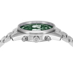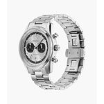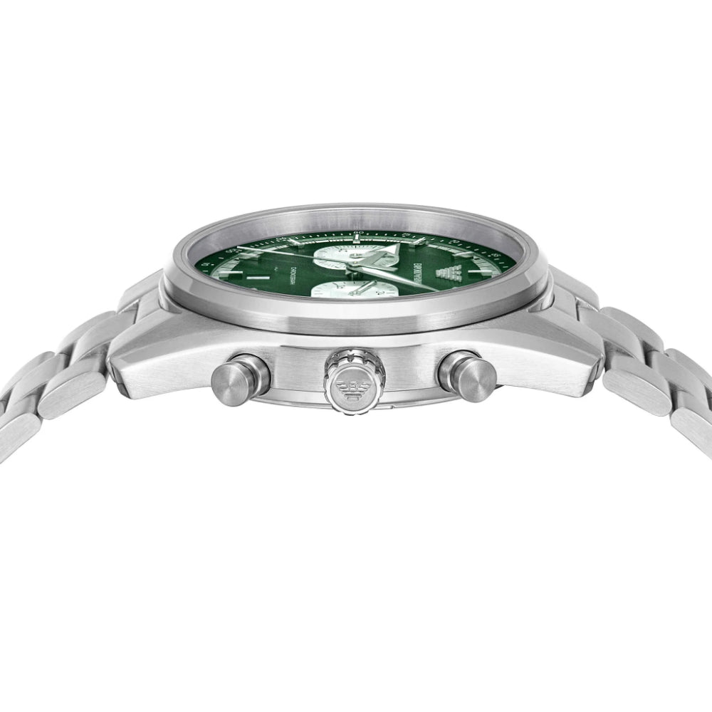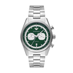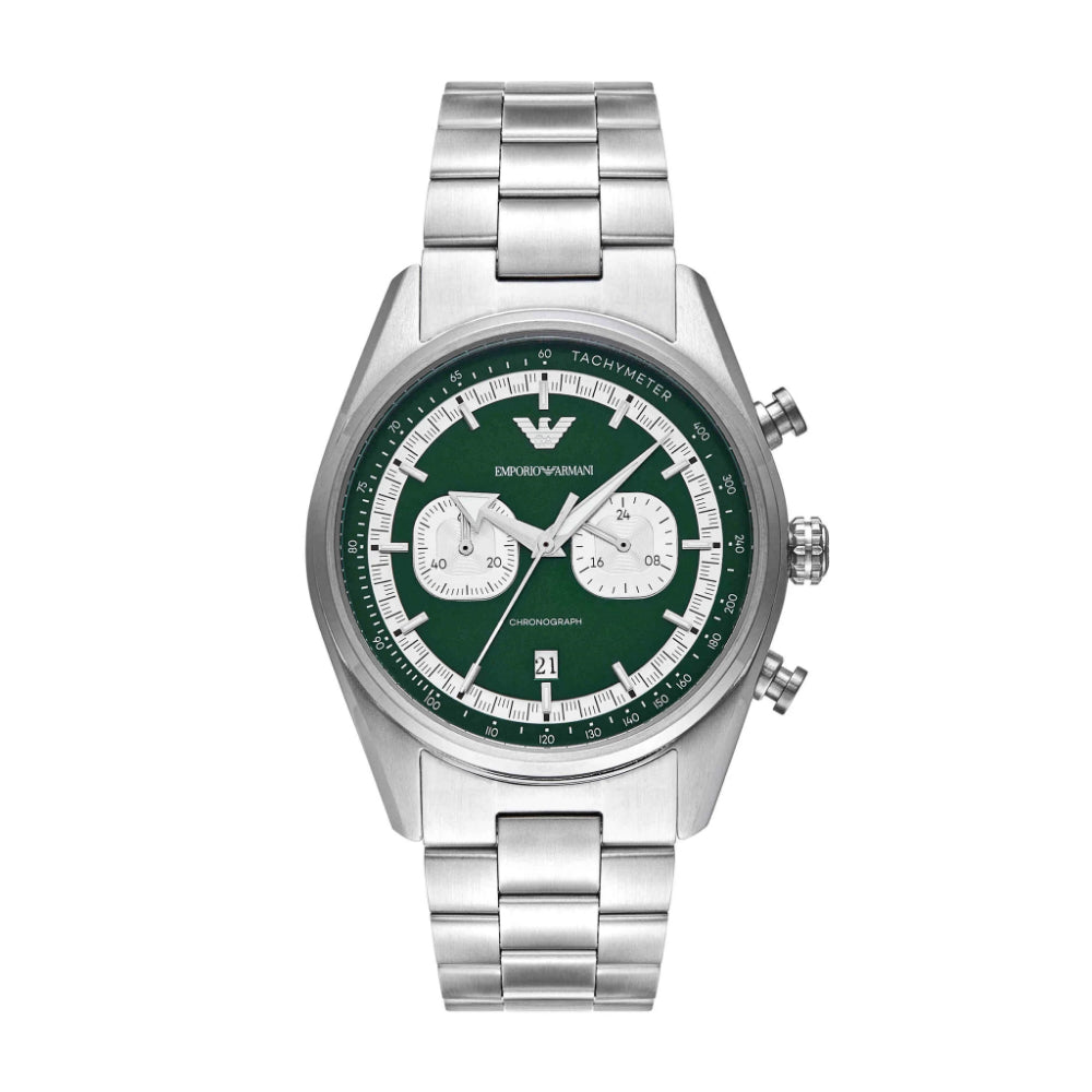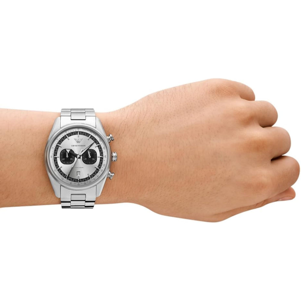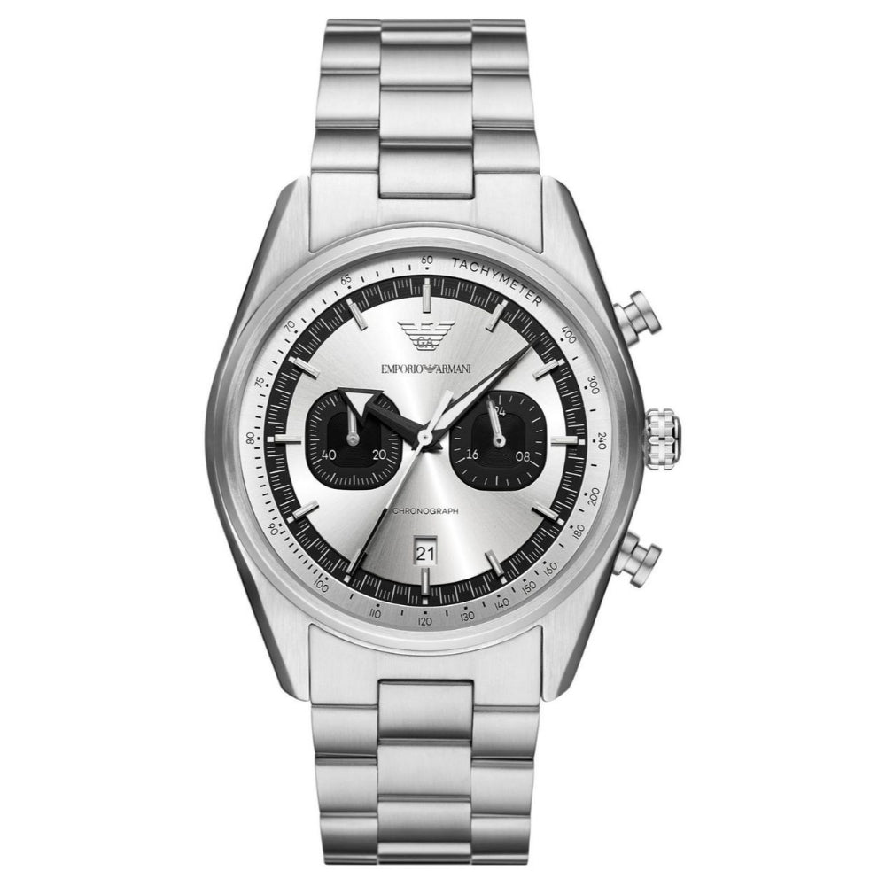 Emporio Armani's 42mm watch features a silver sunray dial with black cd finished sub-eyes, chronograph movement and stainless steel bracelet. Amaze everyone around you by wearing this men's analog watch from the collection by Emporio Armani. The two tone round dial is protected by a mineral glass. It features a crown for time adjustment.