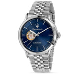 The Maserati EPOCA BR SS R8823118018 from the Maserati Epoca collection combines classic charm with modern features. This watch features a 42 mm diameter, making a bold statement on the wrist. Its blue dial stands out with a partially open design, revealing the intricate internal mechanism. This open heart feature, along with the transparent backcase, adds a touch of mechanical intrigue. The watch's automatic movement enhances its appeal, while the stainless steel case and strap ensure a cohesive look with a silver-tone finish.