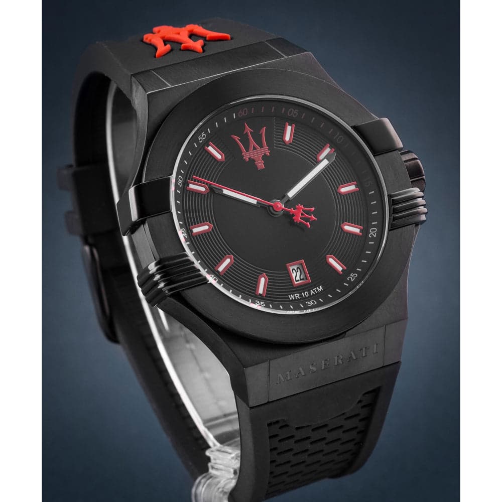 This Maserati watch has a black stainless steel case 45mm in diameter and is fitted with a leather strap. Inside the case lies a quartz movement and the watch features a mineral crystal.