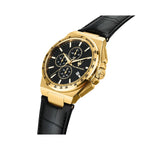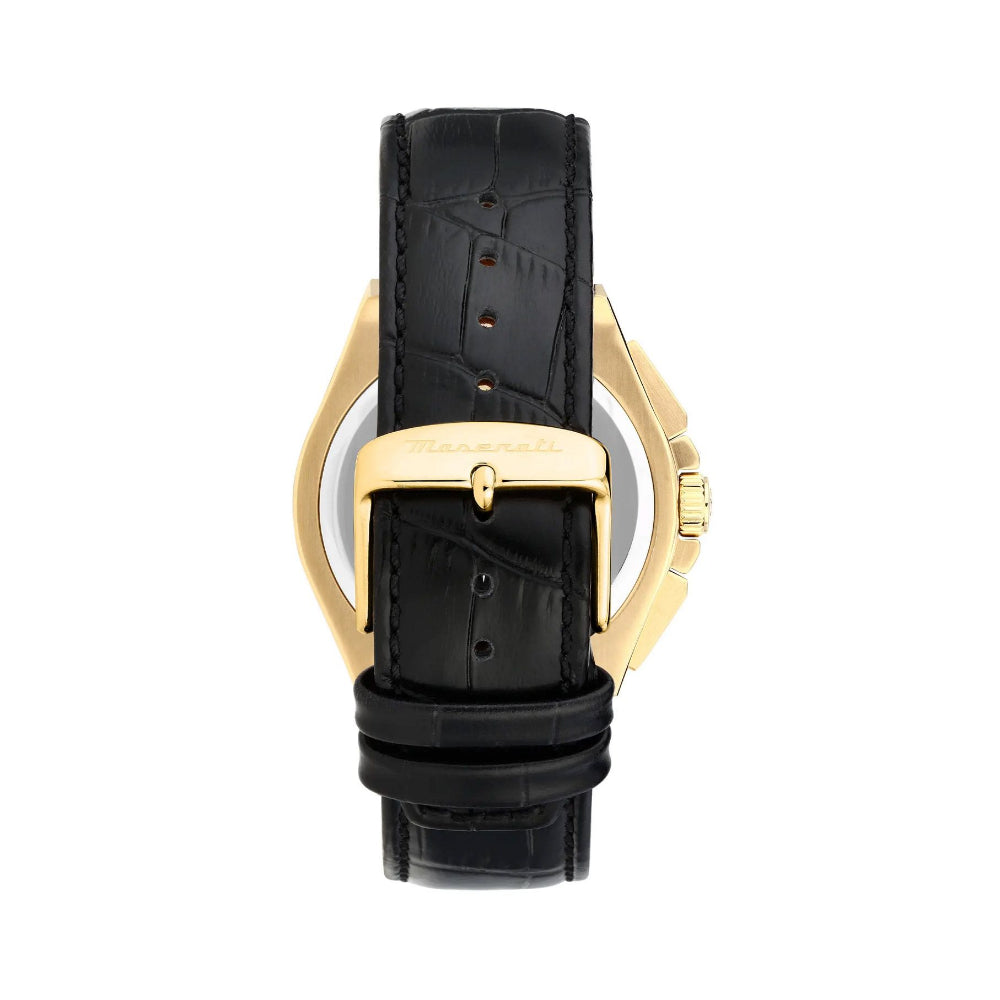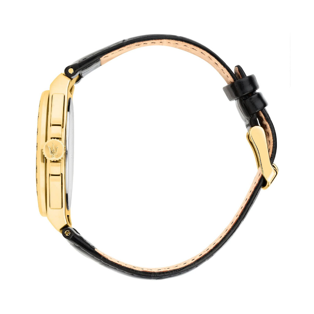 Maserati Velocita Slim R8871653001 is an elegant men's watch, in which a gold PVD-coated stainless steel envelope is paired with a black leather strap. The dial features a day-of-the-month date and chronograph function. The hands are coated with a luminescent coating, which makes it easier to read the time even after dark. The model features a water resistance of 50 meters, which means resistance to rain and brief immersion in water.