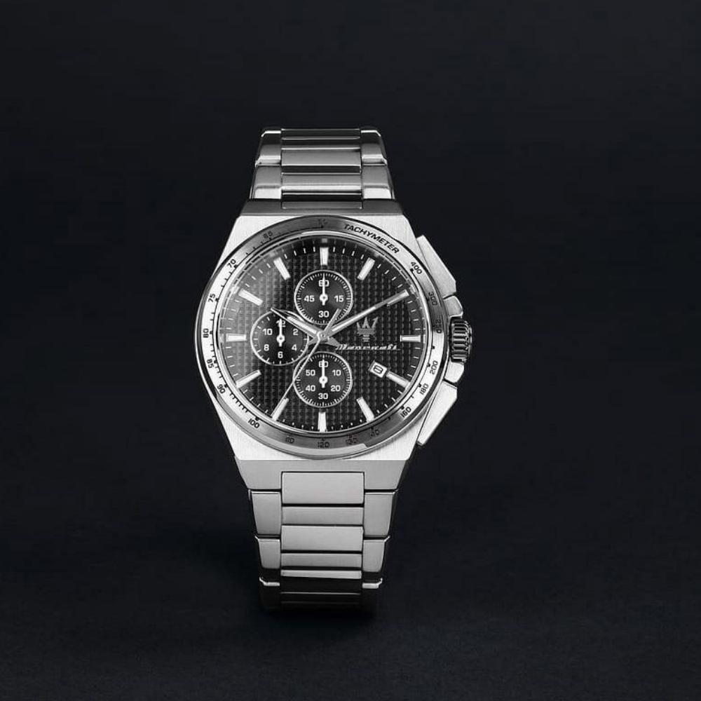 The Maserati Velocita Slim R8873653004 watch is maintained in an elegant silver design, encompassing a stainless steel envelope and bracelet. The dial features chronograph and tachometer functions, as well as a date of the days of the month. The hands were coated with a luminescent coating, which improves legibility even in the dark. The watch operates on the basis of a quartz movement, and its water resistance of 50 meters allows for use in everyday situations.