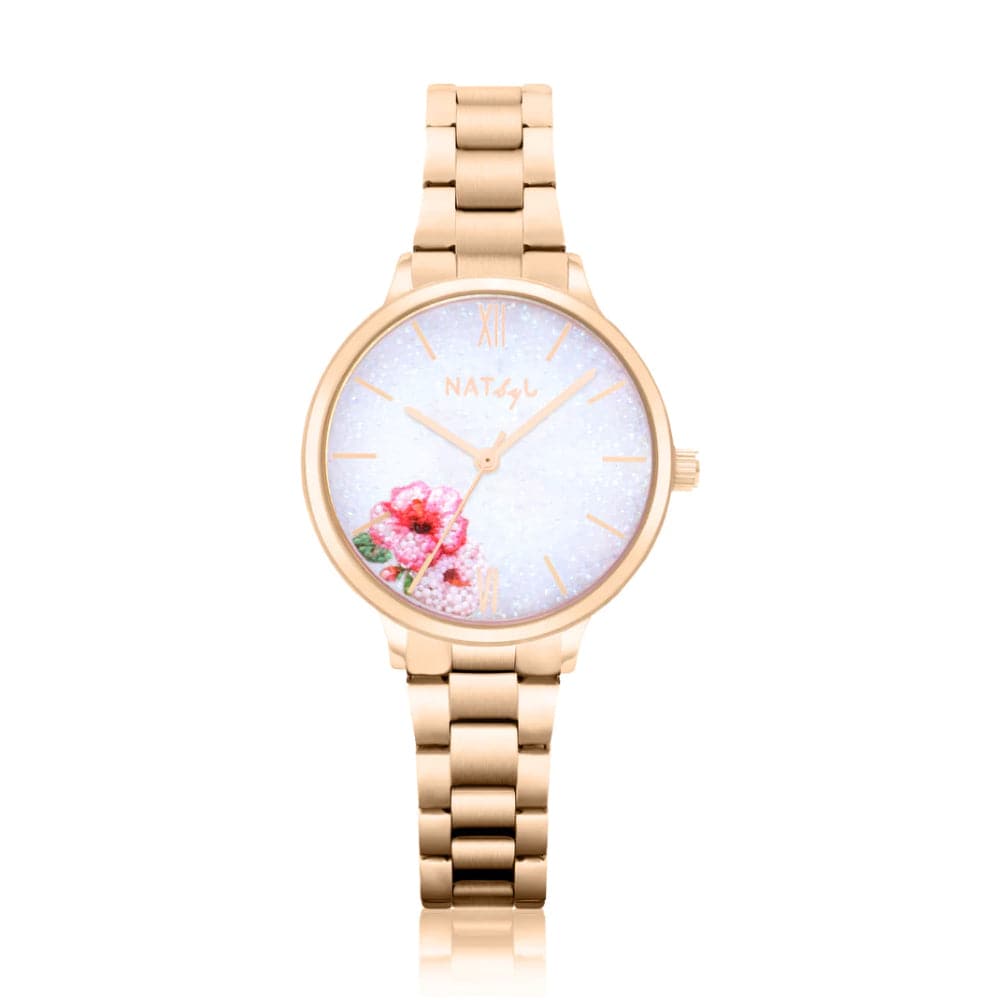 Inspired by the confidence in every woman, the NATbyJ Dazzle collection showcases beautiful sparkling pieces that glamourize and dazzle any outfit. The dial features sparkling crystal dust with a beautiful pink hibiscus flower, paired with a rose gold-plated link bracelet and case.