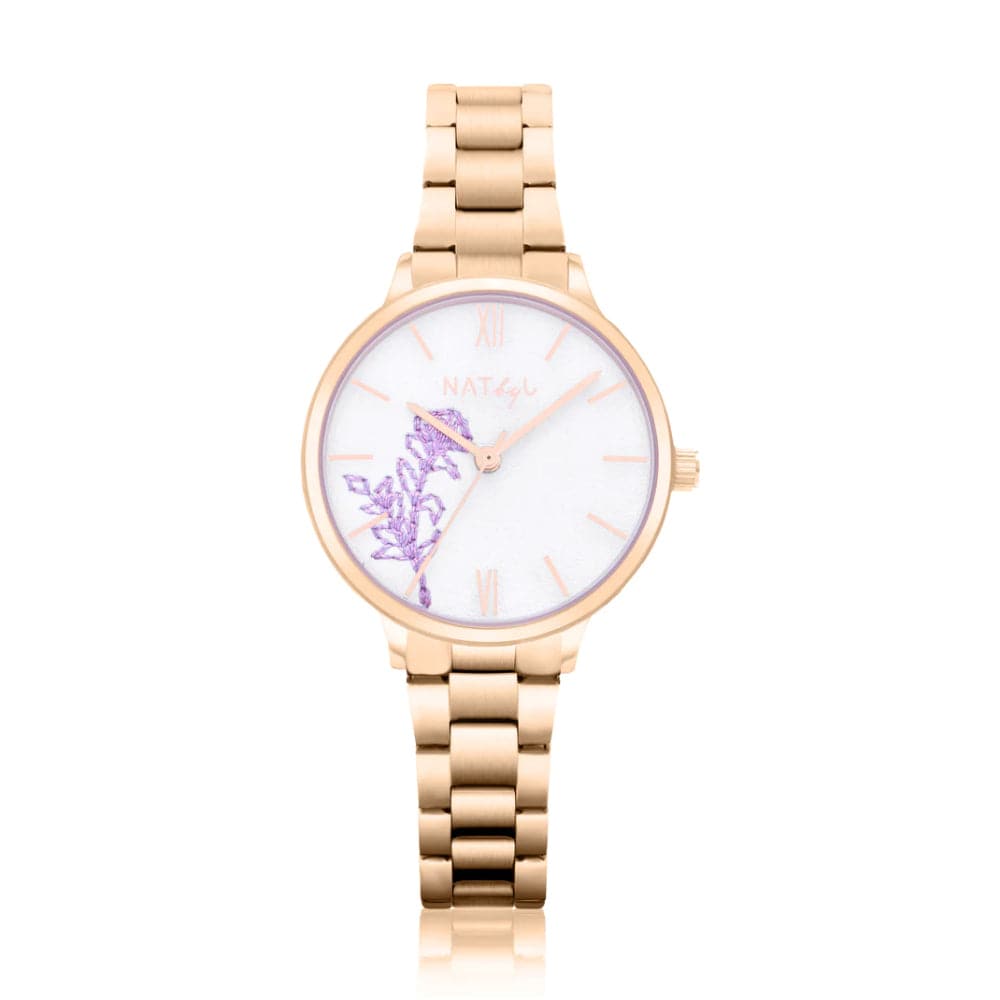 The NATbyJ Dream timepiece is to inspire every woman to dream BIG. Let your dream be beautifully woven like the distinctive embroidery design, using rose gold thread on a delicate cream leather dial. Complete the look by pairing the rose gold-plated stainless steel case with a lightweight rose gold-plated link bracelet that fits perfectly on a dainty wrist.