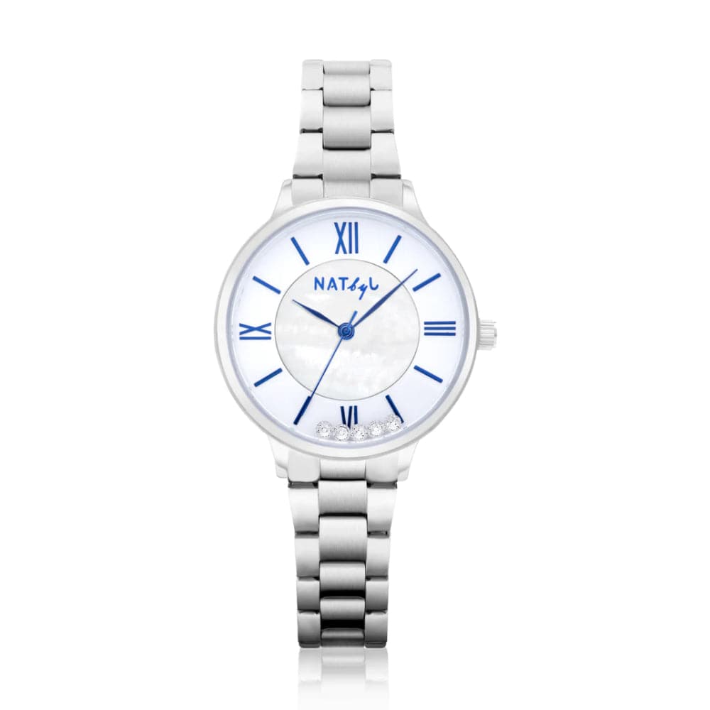 Inspired by the shining stars that navigate us through the midnight skies, our NATbyJ Stargaze Collection represents the people who support you through dark times and inspire you. The timepiece features sparkling crystals that dance freely around the white dial, paired with a stainless steel link bracelet and case. The design elements represent the stars that glide freely around the night sky, and a lustrous Mother of Pearl dial represents the captivating moon.