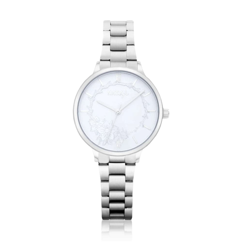 Our NATbyJ Unity collection is designed to represent the deep connections found in relationships. The NATbyJ Unity 0801M timepiece features a two-layered white dial that allows the gently carved-out intricate floral design to stand out in a circular alignment and represents a reunion of family and friends. Complete the look by pairing the stainless steel case with a lightweight stainless steel link bracelet.