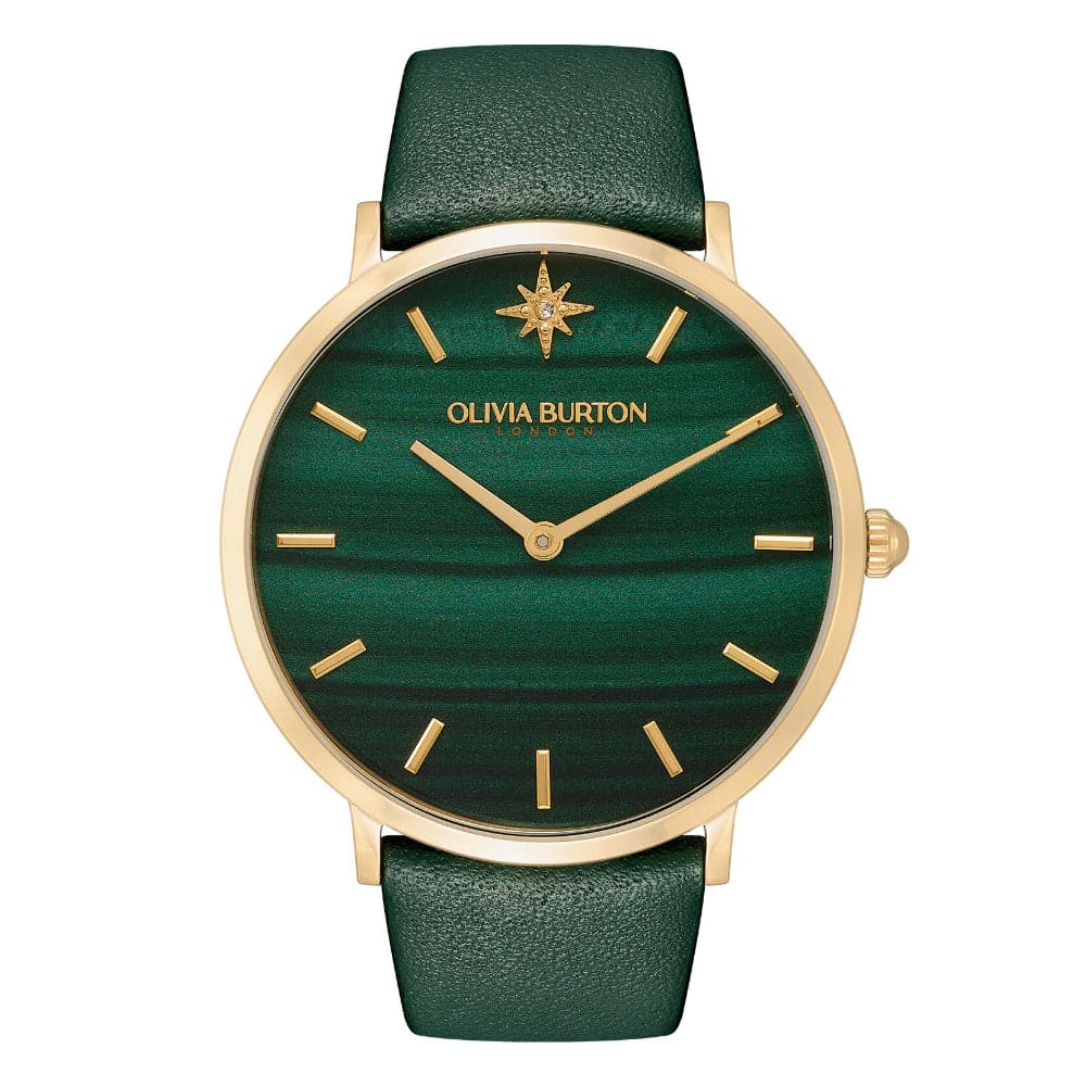 Inspired by the mystique of the cosmos, this dial imitates the colours of planetary atmospheres. The face is crafted from faux malachite, finished with a North Star crystal marker and a midnight-green leather strap. The gold-plated ultra-slim case has a sleek fit, containing an otherworldly glow at the touch of your fingers (and wrist).