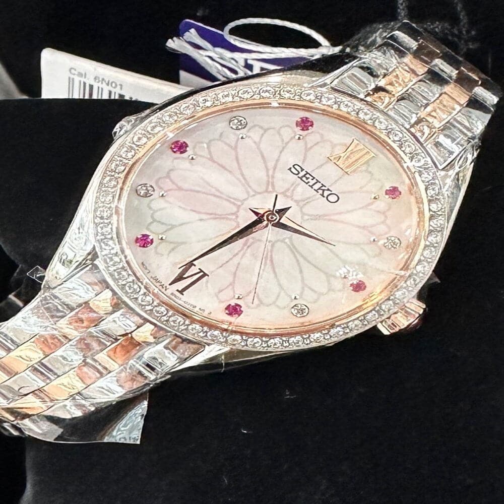 A dial encrusted with crystals, a beautiful pattern on the dial surface and indices styled like studs join hands to power the flow of time in this supremely crafted Seiko dress watch for ladies. This limited edition timepiece is encased in stainless steel and features Caliber 6N01 at its heart.