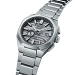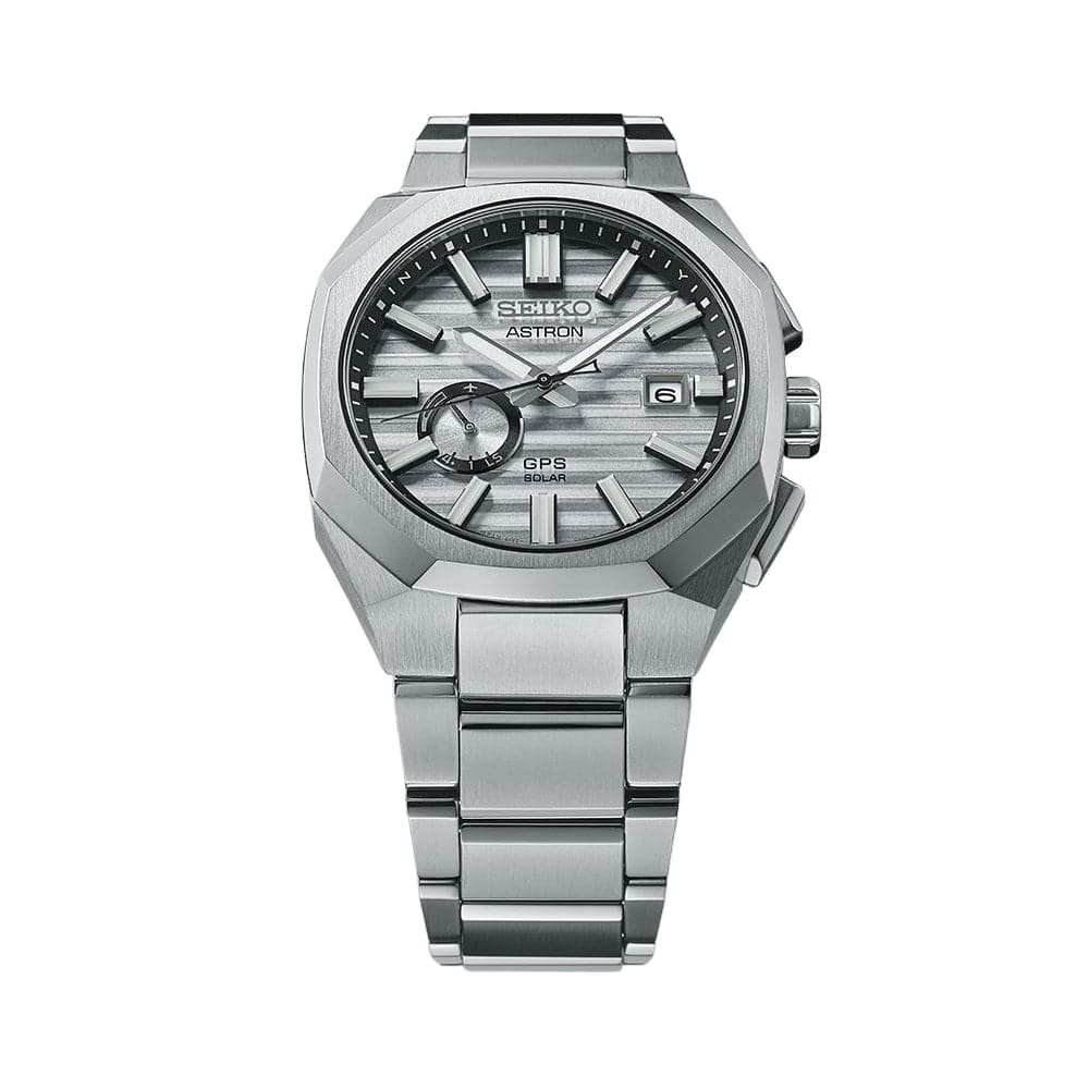 The Astron GPS Solar SSJ013J1 is one of the most advanced wristwatches in the world. It is equipped with a new GPS Solar movement, caliber 3X62, whose improved reception of solar signals has increased the accuracy of the watch. The new series has a dynamic presence thanks to the dimensional case and the faceted bezel with hairline finishing on top, which contrasts with the polished sides. The case lines flow seamlessly through the lugs to an integrated bracelet that has a sharp design that matches the angular case to give the watches a refined appearance. Matched to the color of the bezel, the applied indexes and the hour and minute hands, all filled with Lumibrite, enable easy reading in every viewing condition. The grey dial features a pattern that evokes the quartz crystals used to create the tuning fork-shaped quartz oscillators of the original Quartz Astron introduced by Seiko in 1969. Limited edition 1,500 pieces worldwide.