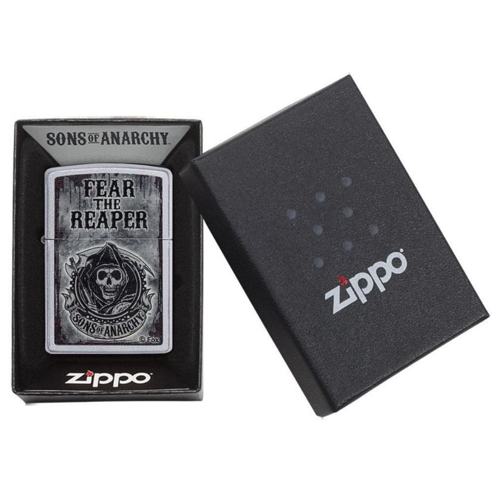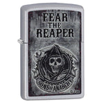 Make this lighter a part of your Sons of Anarchy collection. This Satin Chrome™ windproof lighter features the Sons of Anarchy motto “Fear the Reaper,” the Grim Reaper logo, and the Sons of Anarchy ribbon design.