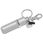 Take along an extra refill of Zippo premium lighter fluid. Reusable personal-sized aluminum canister holds enough fuel to fill one Zippo windproof lighter or a 6 hour fill on a Hand Warmer. Includes swivel snap fastener, split ring for keys, disk to tighten and loosen flint screw, and rubber storage sleeve for two extra Zippo flints.